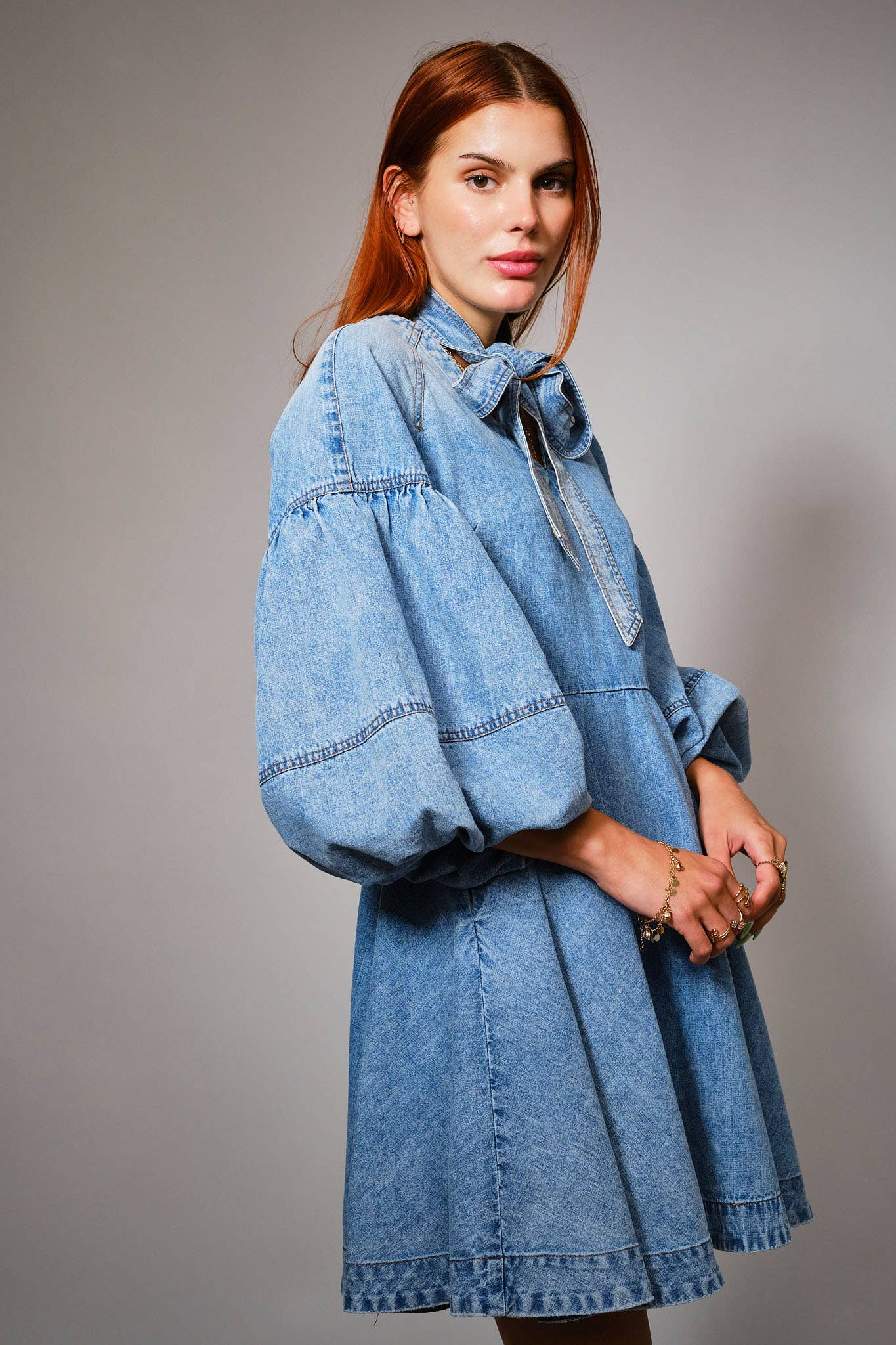 Tie Neck Puff Sleeve Denim Dress
