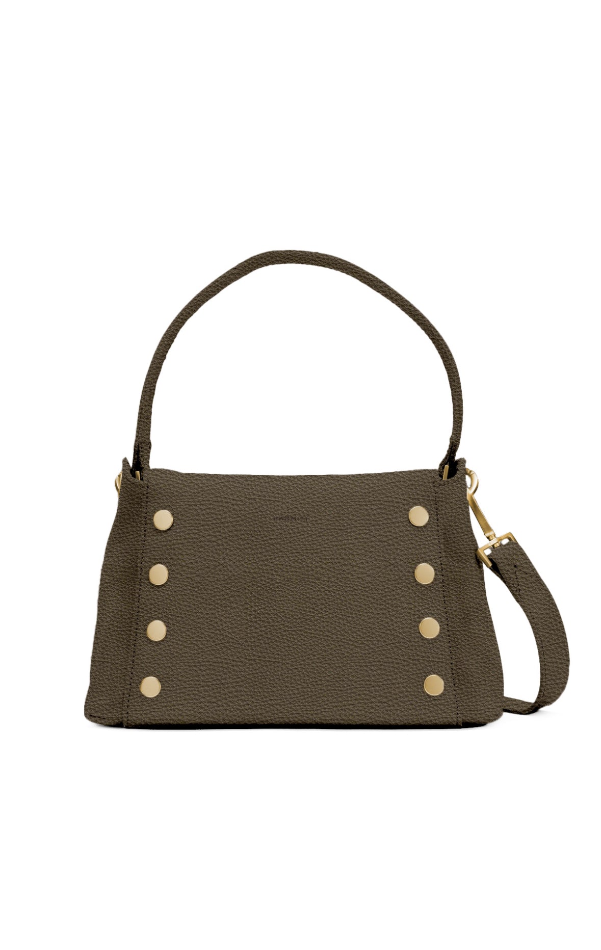 Meet our Bryant medium, a space-efficient style with plenty of room and added accessibility. Our classic black pebbled leather paired with our brushed gold hardware and a bonus riveted short strap.
